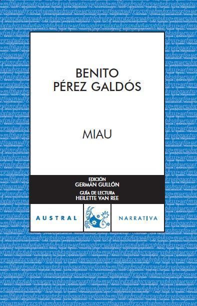 Benito Pérez Galdós (1843-1920) fue un hombre de gran cultura y vitalidad, ávido lector de literatura inglesa y francesa de su época y amante de las artes. A pesar de que su obra narrativa se enmarca tradicionalmente en el realismo, Galdós superó este esquema y, como antes hiciera Cervantes, creó vidas y mundos de ficción en los que lo irreal se muestra en perpetuo conflicto entre la razón y el corazón. Su gran maestría en la descripción de las costumbres de la época y su facilidad para ahondar en las vicisitudes del alma humana tienen en "Miau" uno de sus mejores exponentes. En esta obra, Galdós relata las distintas formas en que el individuo puede amoldarse o vivir en desajuste con las normas de la sociedad burguesa, a través del descenso a los infiernos del funcionario Ramón Villamil, despedido poco antes de poder disfrutar de su jubilación. Sin recursos económicos, sin apoyo del Estado y abandonado por todos, Galdós insinúa que la única posibilidad de salvación de su personaje está en sí mismo, en sus sentimientos y en su espiritualidad. Edición de Germán Gullón y Heilette van Ree.