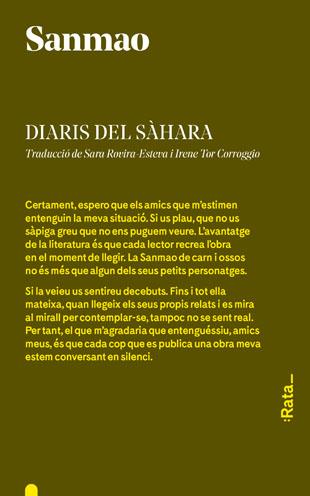 Sanmao és camí, és recerca i és vida, però sobretot és llibertat. Chenping, Echo, Sanmao: tres noms, tres nacionalitats que il·lustren la naturalesa errant de l'autora, de qui va fer del camí i dels qui el transiten la seva llar. Sanmao, caminant infatigable, fa bona la dita que la vàlua i la quantitat del tresor són sempre ínfimes si se les compara amb l'aventura que les va precedir; per gran que sigui el botí, sempre significa el mateix: l'arribada a un final, a un punt de no retorn, al nostre destí. Sanmao va fer del camí i la seva vida la més gran de les obres. La veu de Sanmao està destinada a ser universal pel que hi ha de particular en ella. Diaris del Sàhara, publicada l'any 1976, recull els anys que l'autora i el seu marit, José Quero, van viure al continent africà. Novel·la de viatges i memòries, Diaris del Sàhara és una carta d'amor incondicional i un cant a la vida que ens ofereix un testimoni directe de la trobada cultural que va viure la jove parella a l'entorn sahrauí. :Rata_ descobreix i publica per primera vegada al nostre país una de?les veus més enigmàtiques i captivadores del continent asiàtic. Per mèrits propis, Sanmao hauria de ser considerada un clàssic del segle XX.