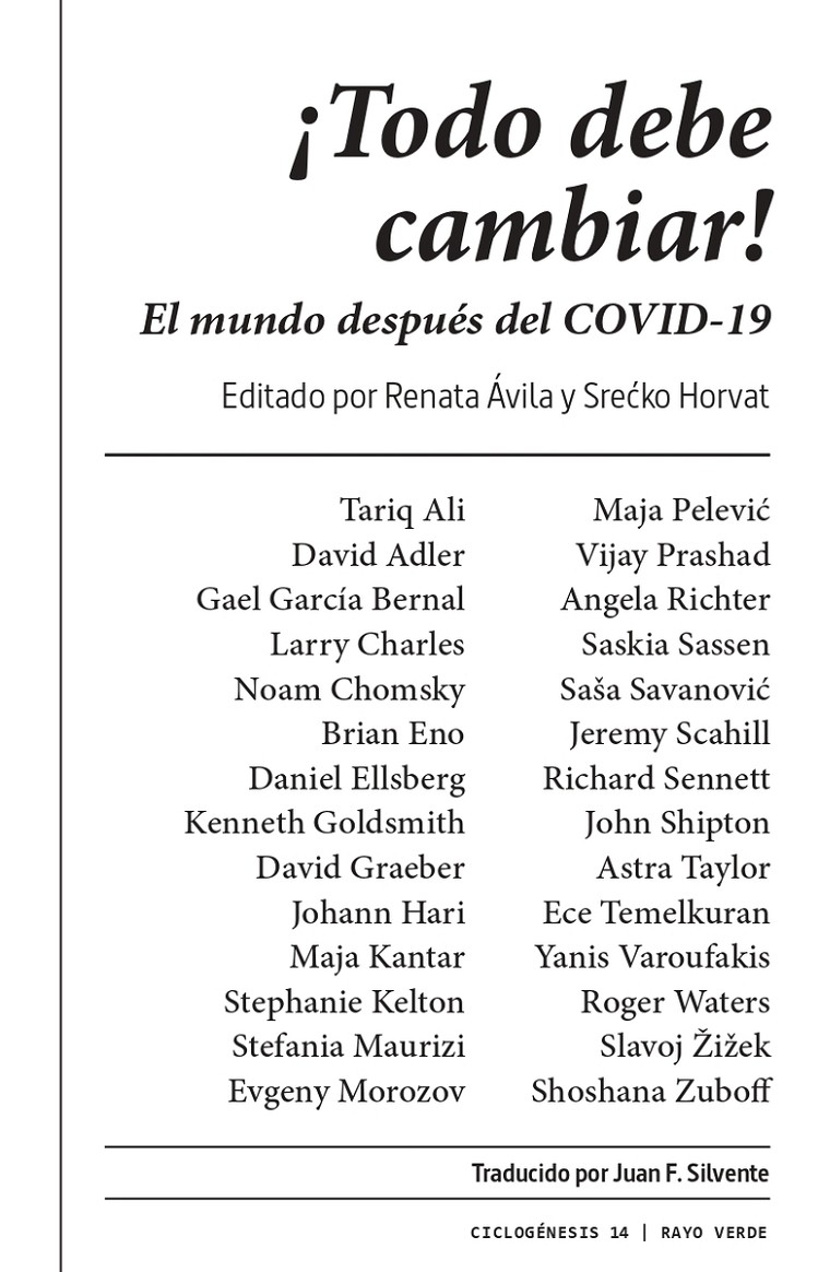 En estas páginas encontrará voces influyentes, que van desde Roger Waters a Noam Chomsky, Slavoj ?i?ek a Saskia Sassen. Gael García Bernal, Brian Eno y Larry Charles examinan las consecuencias más culturales y artísticas de la pandemia, tocando temas de amor, juego, comedia y tiempo. Sus palabras se sitúan junto a análisis de las paradojas y las posibilidades de la deuda, el internacionalismo y la solidaridad por parte de Astra Taylor, David Graeber, Vijay Prashad y Stephanie Kelton.Las crecientes medidas de vigilancia y control en nombre de la salud pública son una preocupación para muchos de los colaboradores de este libro, incluidos Shoshana Zuboff y Evgeny Morozov, así como las oportunidades que presenta la crisis para la explotación por parte de financieros, tecnócratas y la extrema derecha.En contra del retorno a la normalidad y, de hecho, a la noción que nunca había tal cosa, estas conversaciones insisten en que hay un cambio sistémico urgente para hacer frente no sólo a las pandemias derivadas de la destrucción humana de la naturaleza, sino también a las incesantes debilidades de capitalismo global contemporáneo.