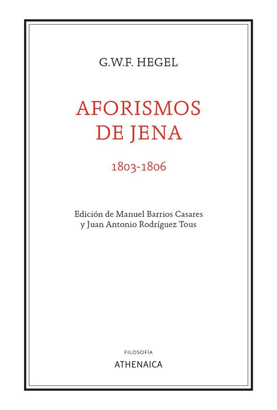 Escritos en un estilo desenfadado y directo, los Aforismos de Jena fueron redactados por Hegel entre 1803 y 1806, años en los que comenzó a componer su primera gran obra, la Fenomenología del Espíritu. El filósofo alemán somete aquí su propio tiempo a un juicio sumarísimo: el mundo moderno, época del triunfo de la Razón y la Libertad, tiene poderosos enemigos, y contra ellos dirige sus invectivas, siempre certeras. Nostálgicos del Antiguo Régimen, románticos anti-ilustrados o viejos racionalistas escolásticos son vapuleados con una contundencia rayana en ocasiones con un hilarante gamberrismo intelectual. La mordacidad de Hegel no se limita a los debates filosóficos o políticos del periodo, sino que se extiende asimismo a la nueva mentalidad pequeño-burguesa. Sus ácidos apuntes sobre el auge del narcisismo sentimental, tan por desgracia vigente en nuestros días, no han perdido un ápice de validez. Merece la pena descubrir a este otro Hegel, pensador entregado a la crítica de la cultura antes que a la disquisición metafísica. Al cuidado de Manuel Barrios Casares y Juan Antonio Rodríguez Tous, esta nueva edición bilingüe de los Aforismos se acompaña de una esclarecedora introducción y de un aparato crítico de notas que localiza citas y referencias ignoradas hasta la fecha.